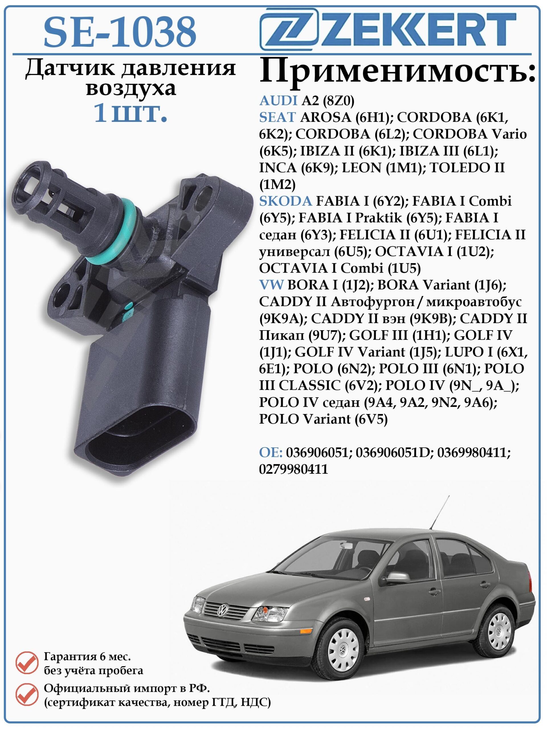 Датчик давления воздуха ZEKKERT SE-1038 для Ауди А2, Сеат Ароса, Кордоба, Ибица, Инка, Леон, Толедо, Шкода Фабия, Фелиция, Октавия, Фольксваген Бора, Кадди, Гольф, Лупо, Поло