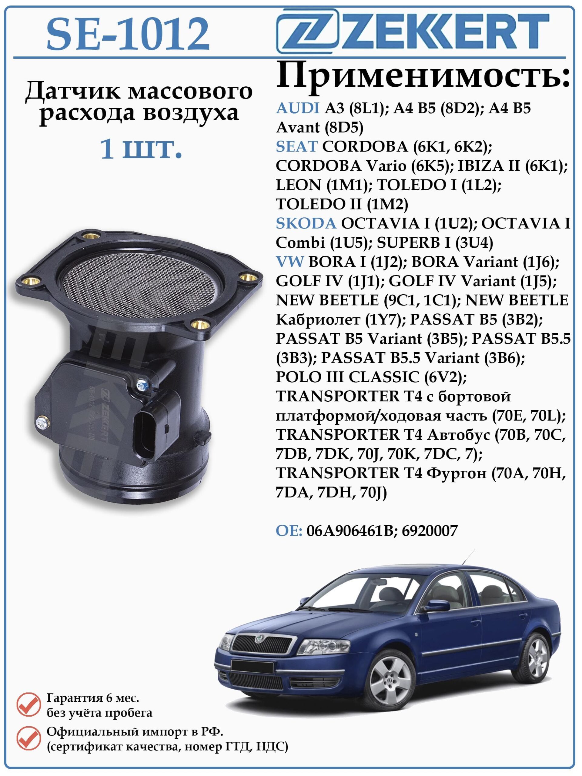 Датчик массового расхода воздуха (ДМРВ) для Ауди А3, А4, Сеат Кордоба, Ибица, Леон, Толедо, Шкода Октавия, Суперб, Фольксваген Бора, Гольф, Жук, Пассат, Поло, Транспортер ZEKKERT SE-1012