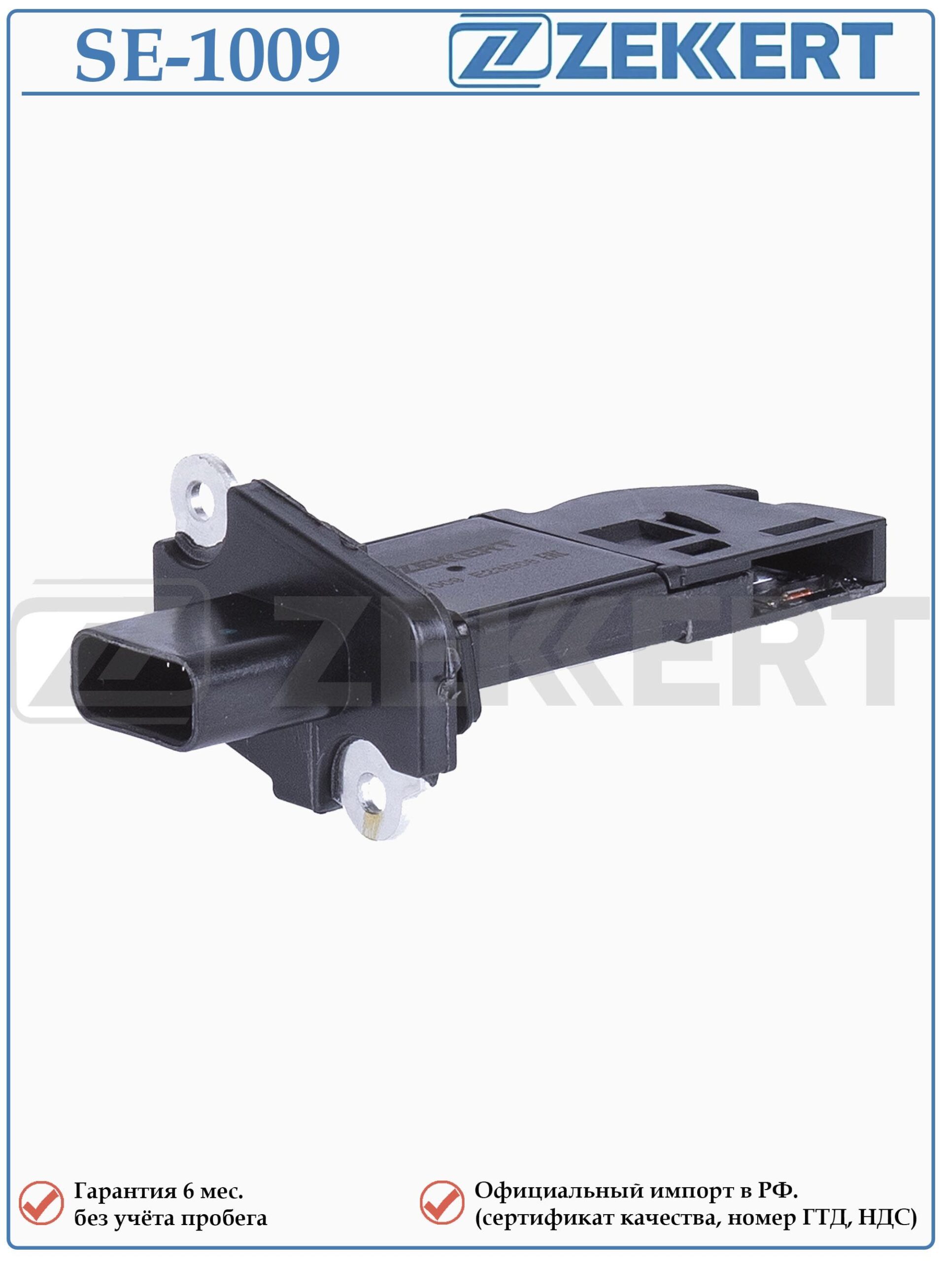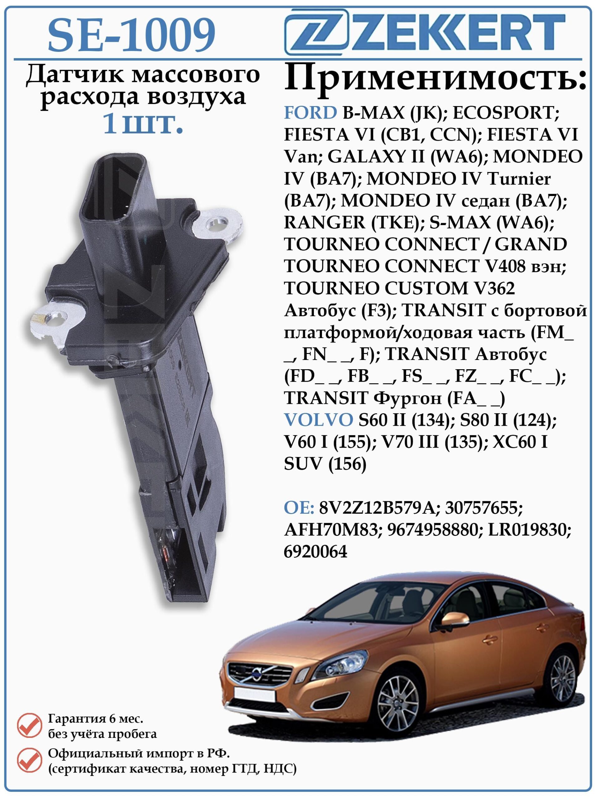 Датчик массового расхода воздуха (ДМРВ) Форд Б-Макс, Экоспорт, Фиеста, Гэлакси, Мондео, Рэйнджер, Торнео Коннект, Торнео Кастом, Транзит, Вольво S60 II , S80 II , V70 III, XC60 ZEKKERT SE-1009
