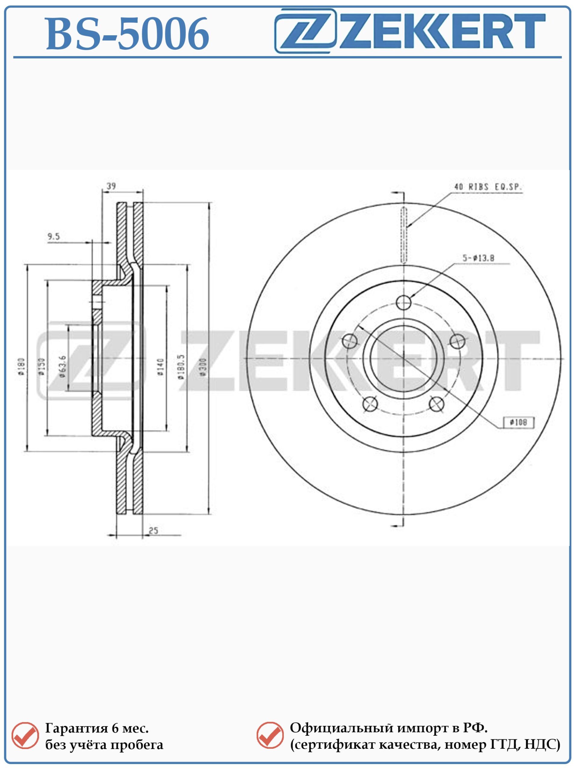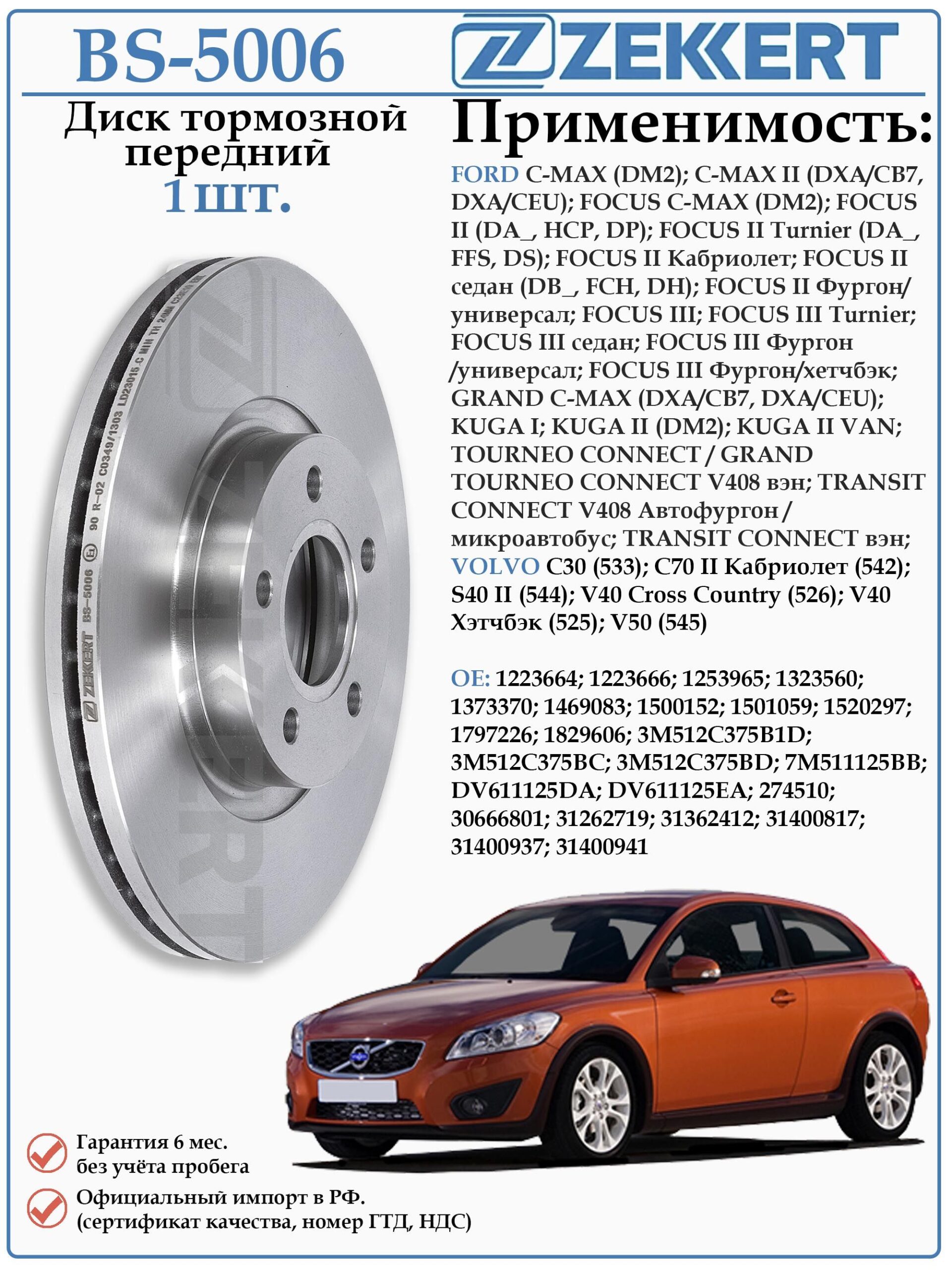 Диск тормозной вентилируемый передний Zekkert BS-5006 для автомобилей Форд Фокус второго и третьего поколений, Форд Куга первого и второго поколений, Форд C-MAX, Вольво S40 II, V40 Cross Country , V40 Хэтчбэк ,V50 (545)