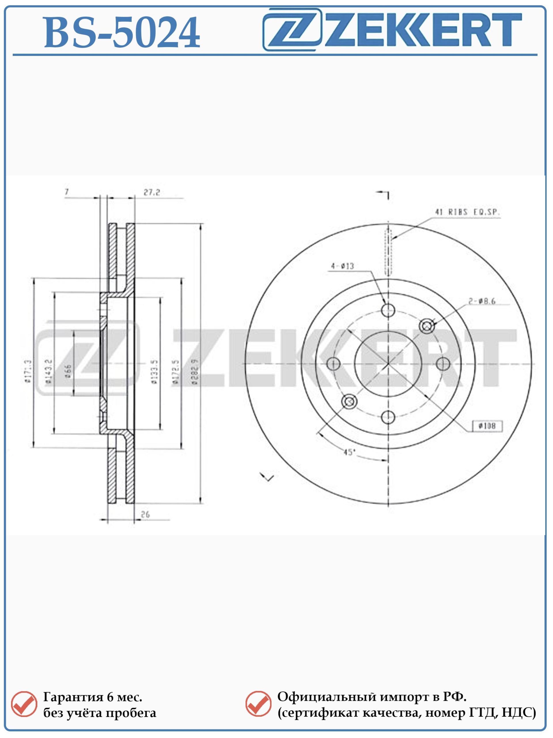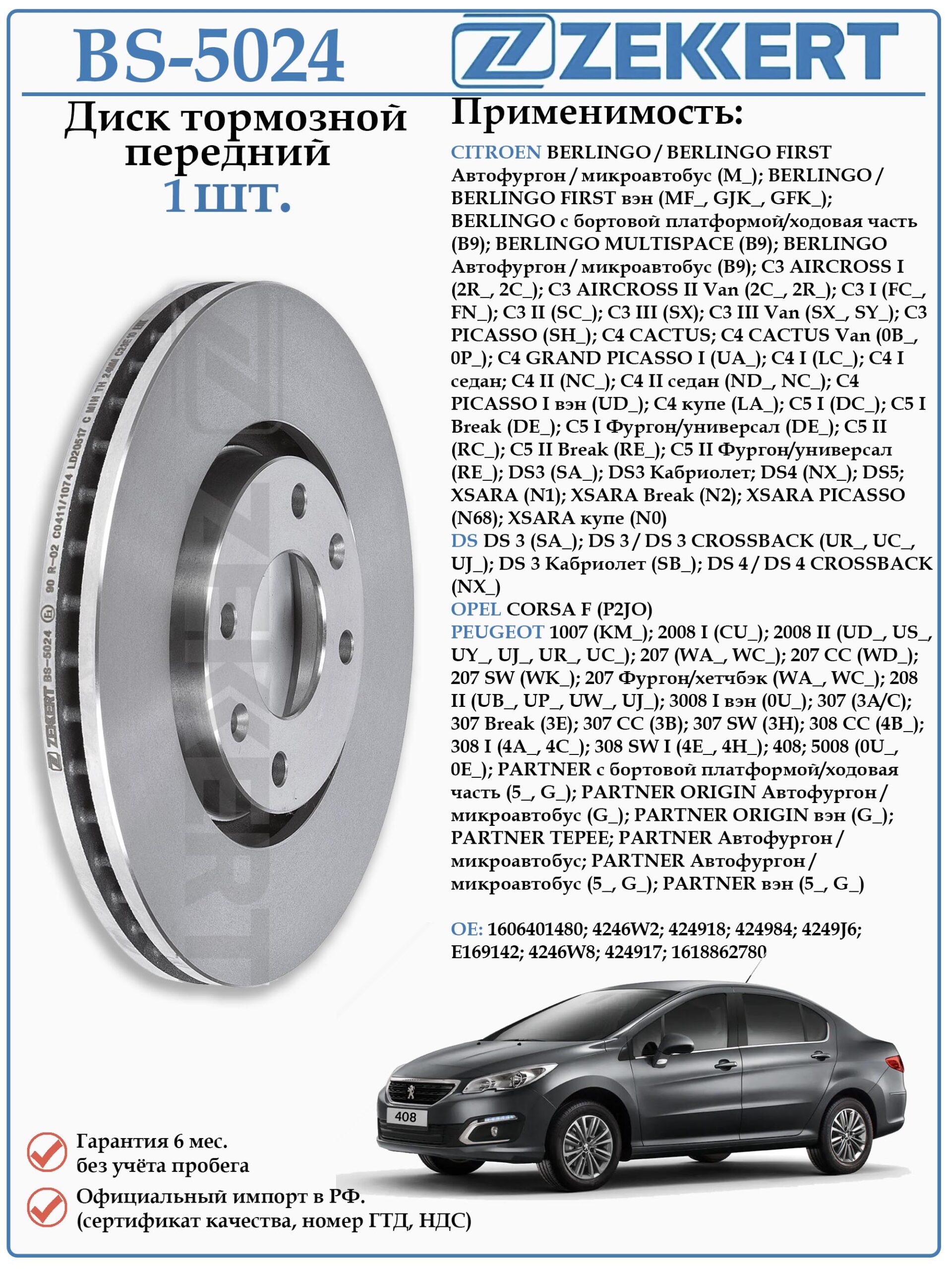 Диск тормозной вентилируемый передний BS-5024 для автомобилей Ситроен, Пежо, DS