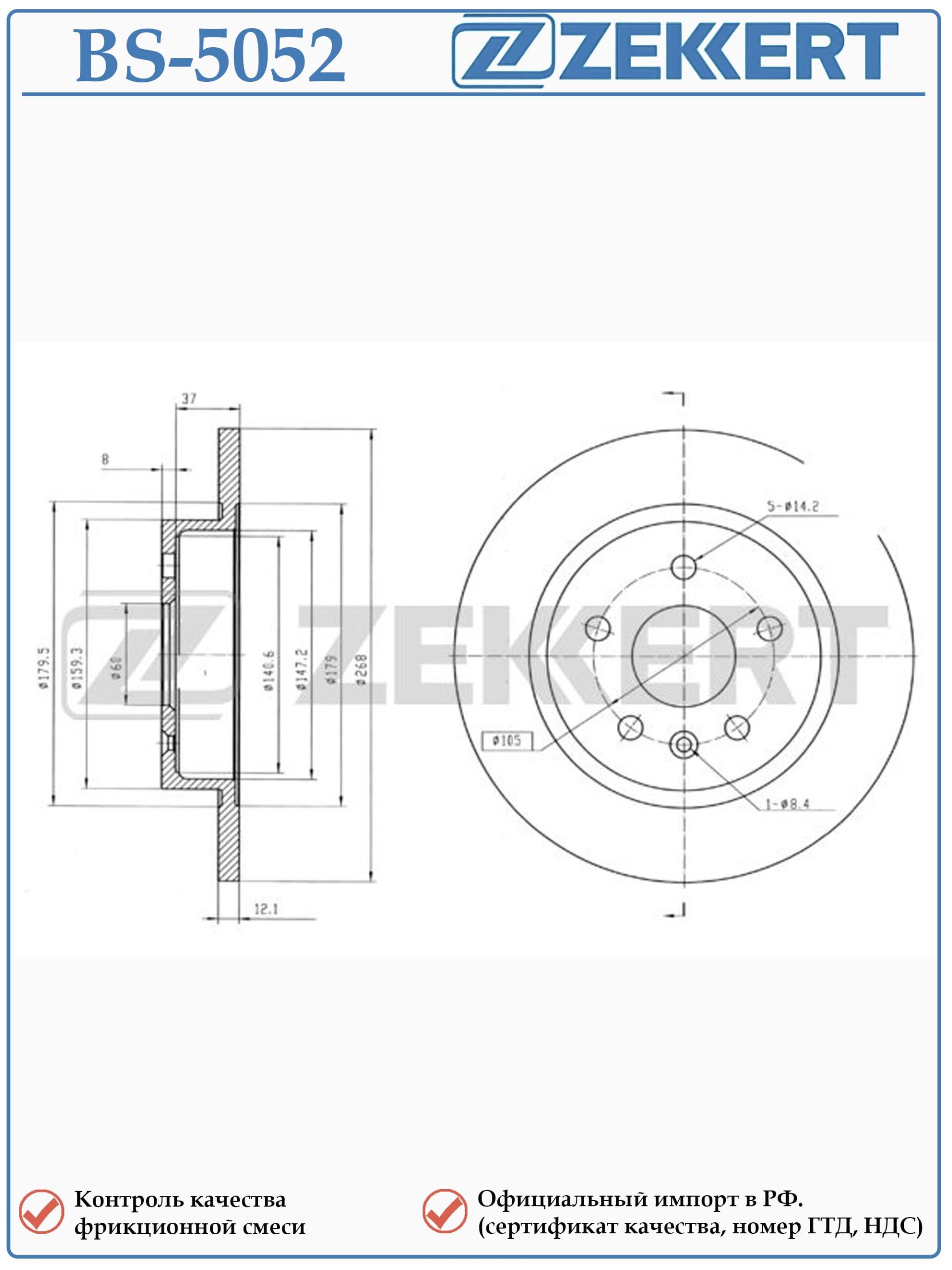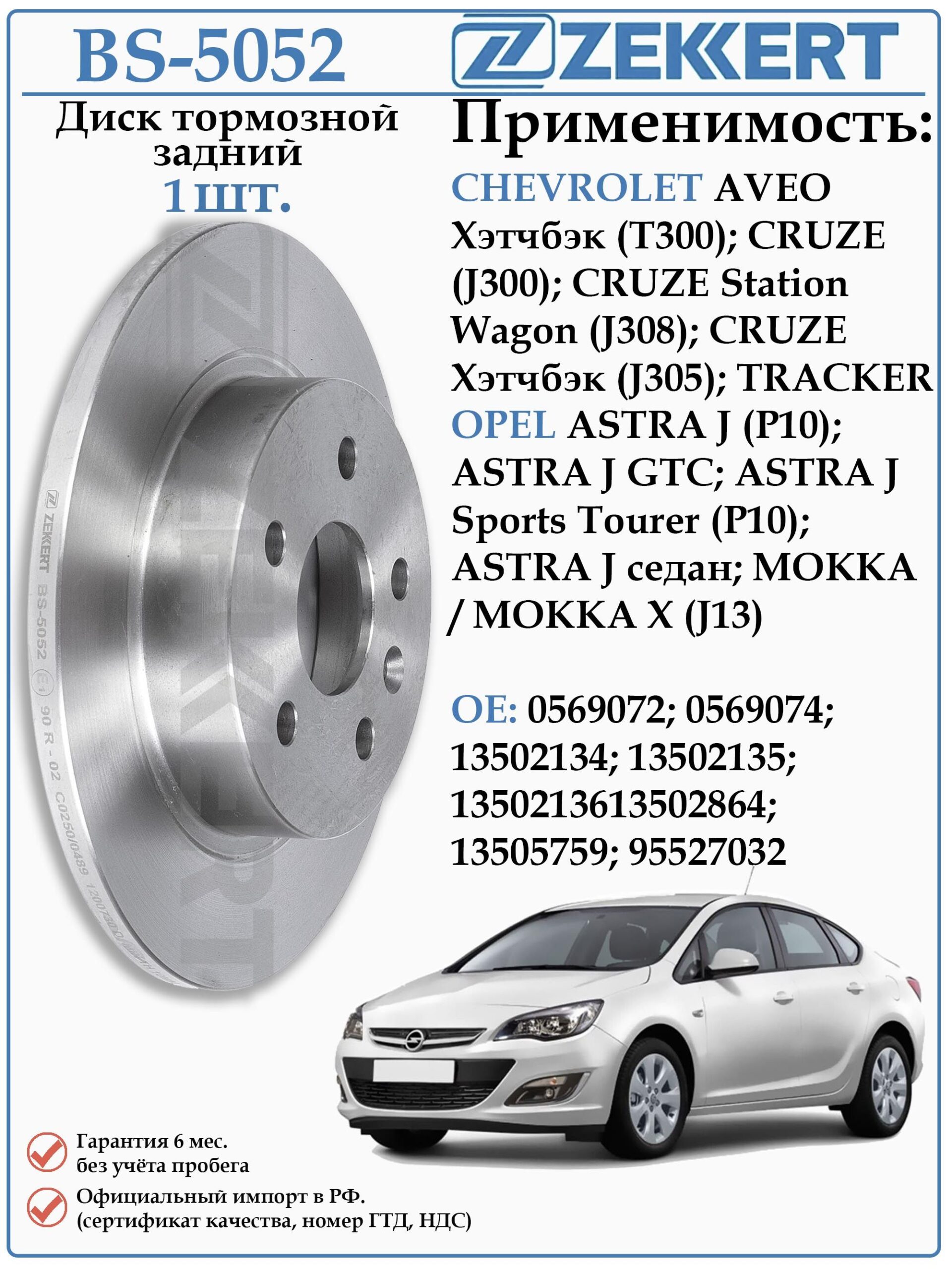 Диск тормозной цельный задний BS-5052 для автомобилей Шевроле Авео, Круз, Траккер, Опель Астра, Мокка