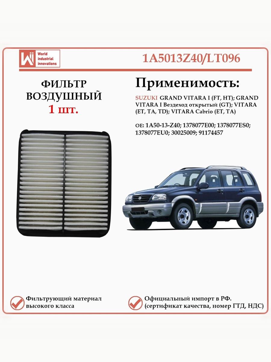 Воздушный фильтр WII AUTO 1A5013Z40/LT096 защищает двигатель вашего автомобиля от пыли, грязи и различных мелких частиц, обеспечивая стабильно высокий уровень чистоты поступающего воздуха. Использование качественных материалов и инновационных технологий делает этот фильтр для двигателя отличным выбором для вашего автомобиля.Воздушный фильтр WII AUTO 1A5013Z40/LT096 применяется для автомобилей Сузуки Гранд Витара первого поколения