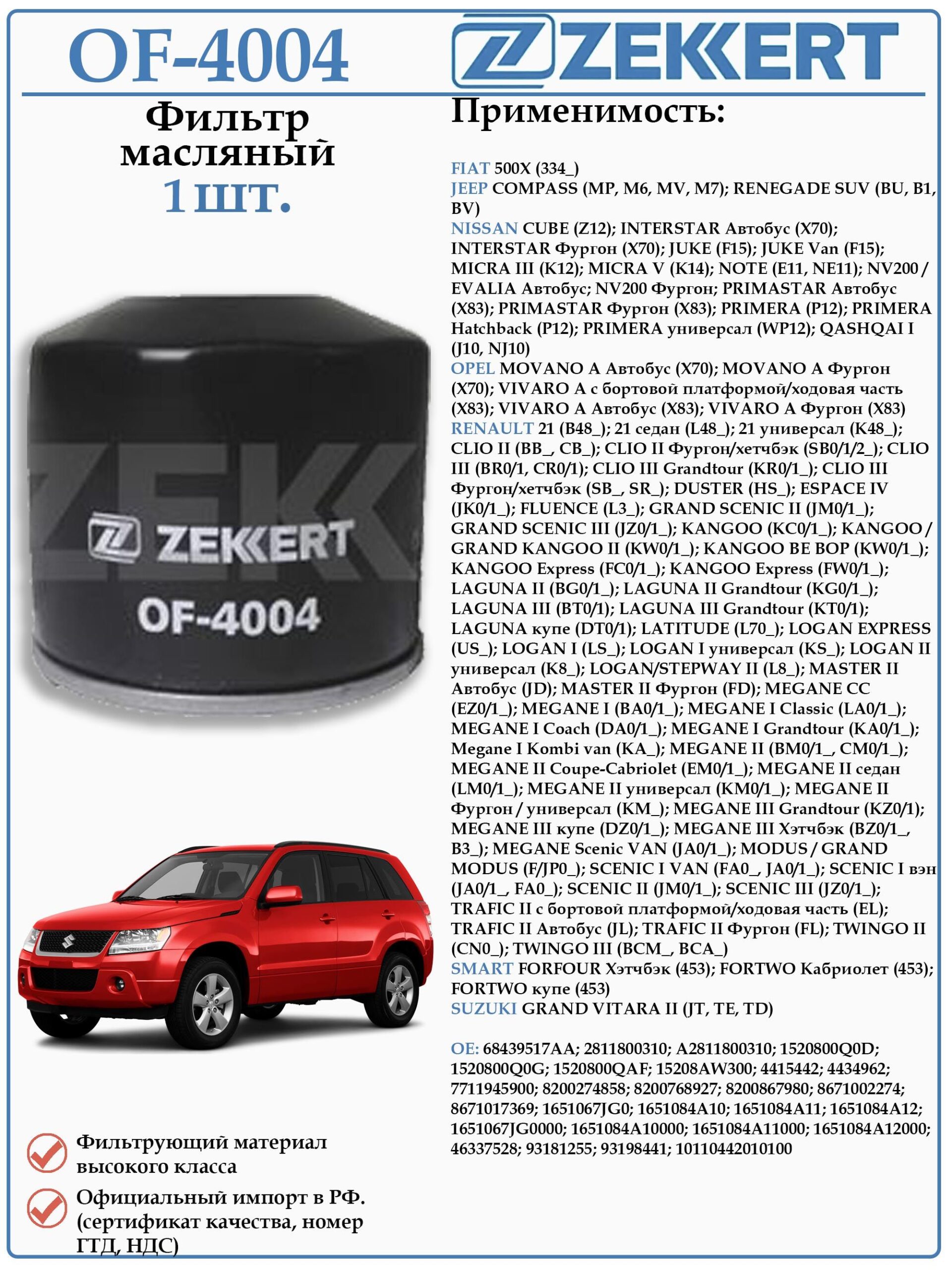 Масляный фильтр ZEKKERT OF-4004, предназначенный для Фиат 500, Джип Компас, Ренегат, Ниссан Куб, Интерстар, Джук, Микра, Ноут, Примастар, Кашкай, Опель Мовано, Виваро, Рено Клио, Дастер, Эспейс, Флюэнс, Сценик, Гранд Сценик, Кангу, Лагуна, Латитуде, Логан, Мастер, Меган, Модус, Смарт Форфо, Форту, Сузуки Гранд Витара