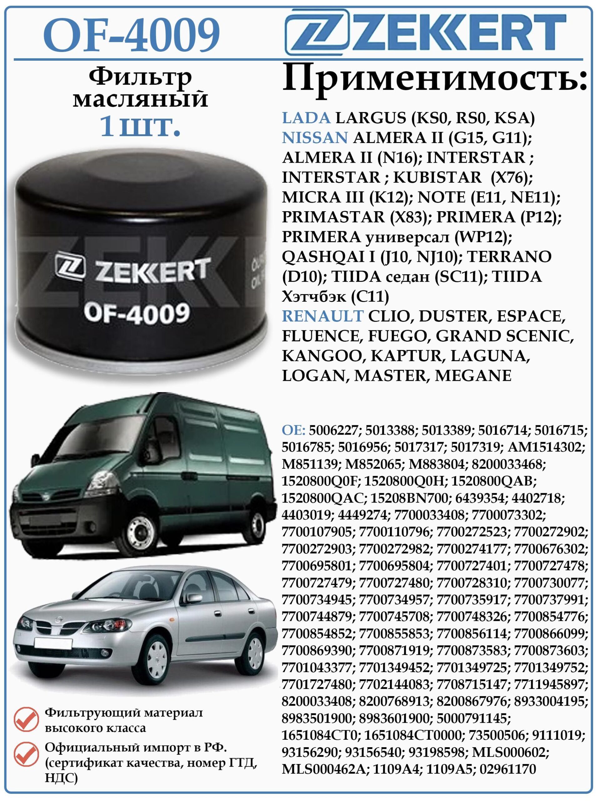 Масляный фильтр ZEKKERT OF-4009, предназначенный для Лада Ларгус, Ниссан Альмера, Интерстар, Кубистар, Микра, Ноут, Примастар, Премьера, Кашкай, Террано, Тиида, Рено Клио, Дастер, Эспейс, Флюенс, Фуего, Гранд Сценик, Кангу, Каптюр, Лагуна, Логан, мастер, Меган