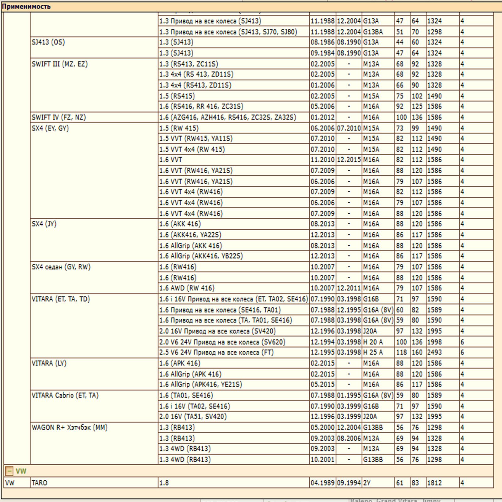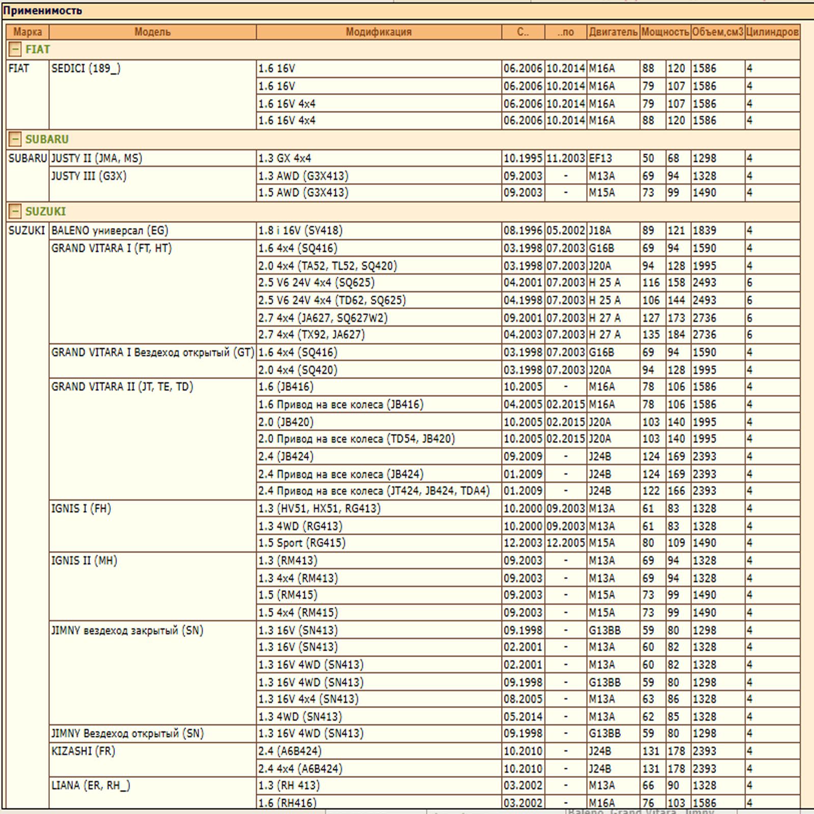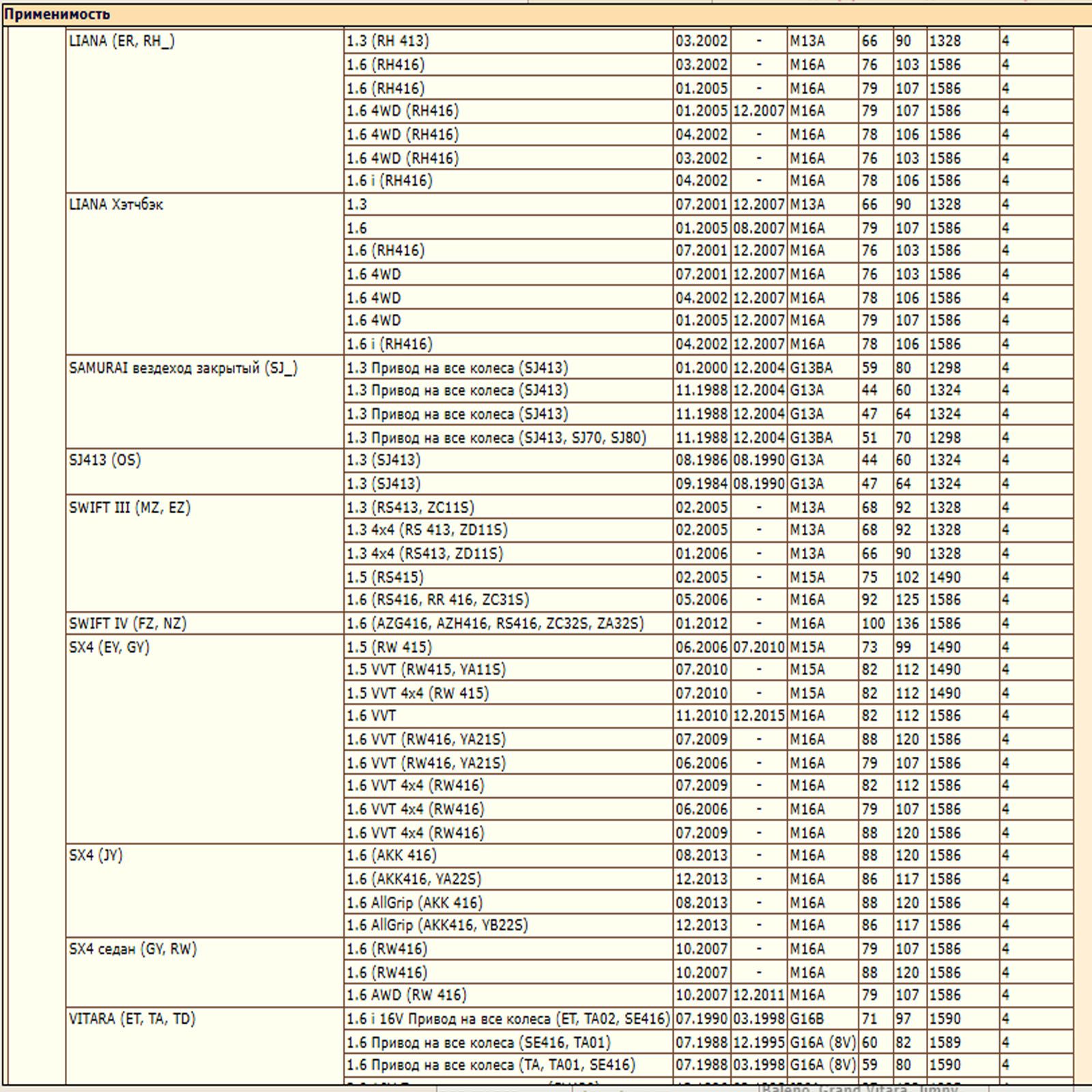✔ SUZUKI BALENO (EG), GRAND VITARA (FT, HT) (JT, TE, TD), IGNIS (FH) (MH), JIMNY (SN), LIANA (ER, RH_), SWIFT (MZ, EZ) (FZ, NZ), SX4 (EY, GY) (JY, RW), VITARA (ET, TA, TD) (LY)