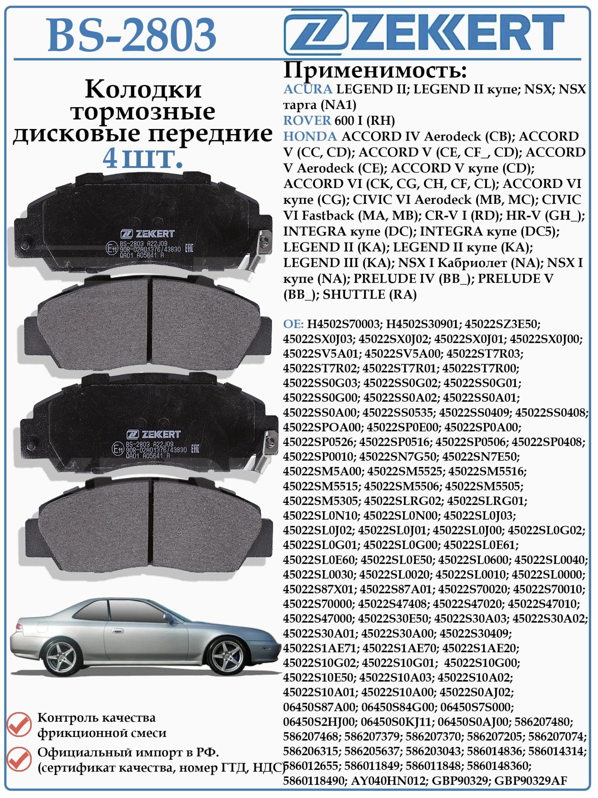 Колодки тормозные передние ZEKKERT BS-2164 для Хонда Аккорд, Ровер 600