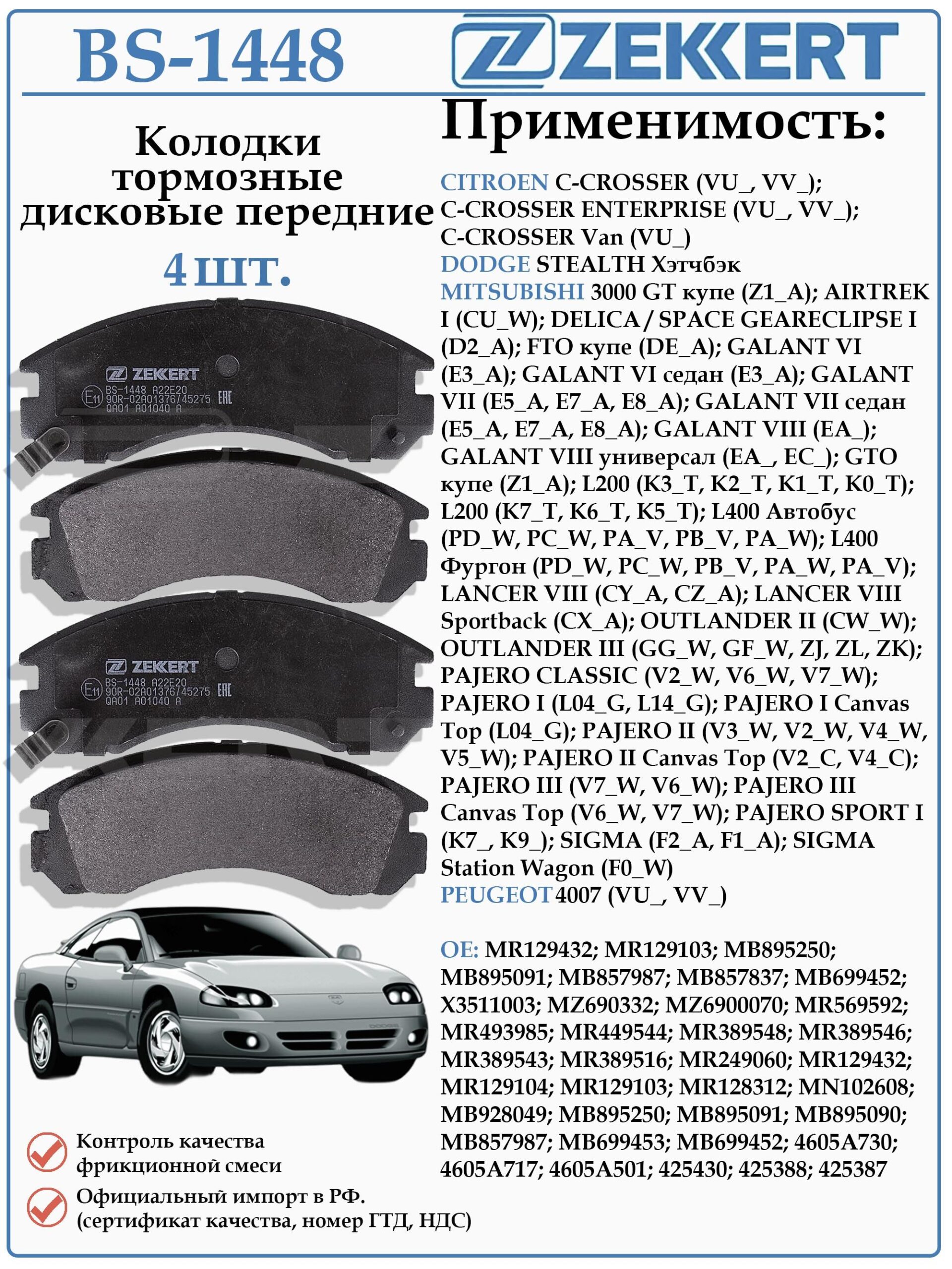Колодки тормозные передние ZEKKERT BS-1448 для автомобилей Мицубиси Паджеро, Аутлендер, Лансер, Пежо 4007, Ситроен C-CROSSER, Додж Стелс