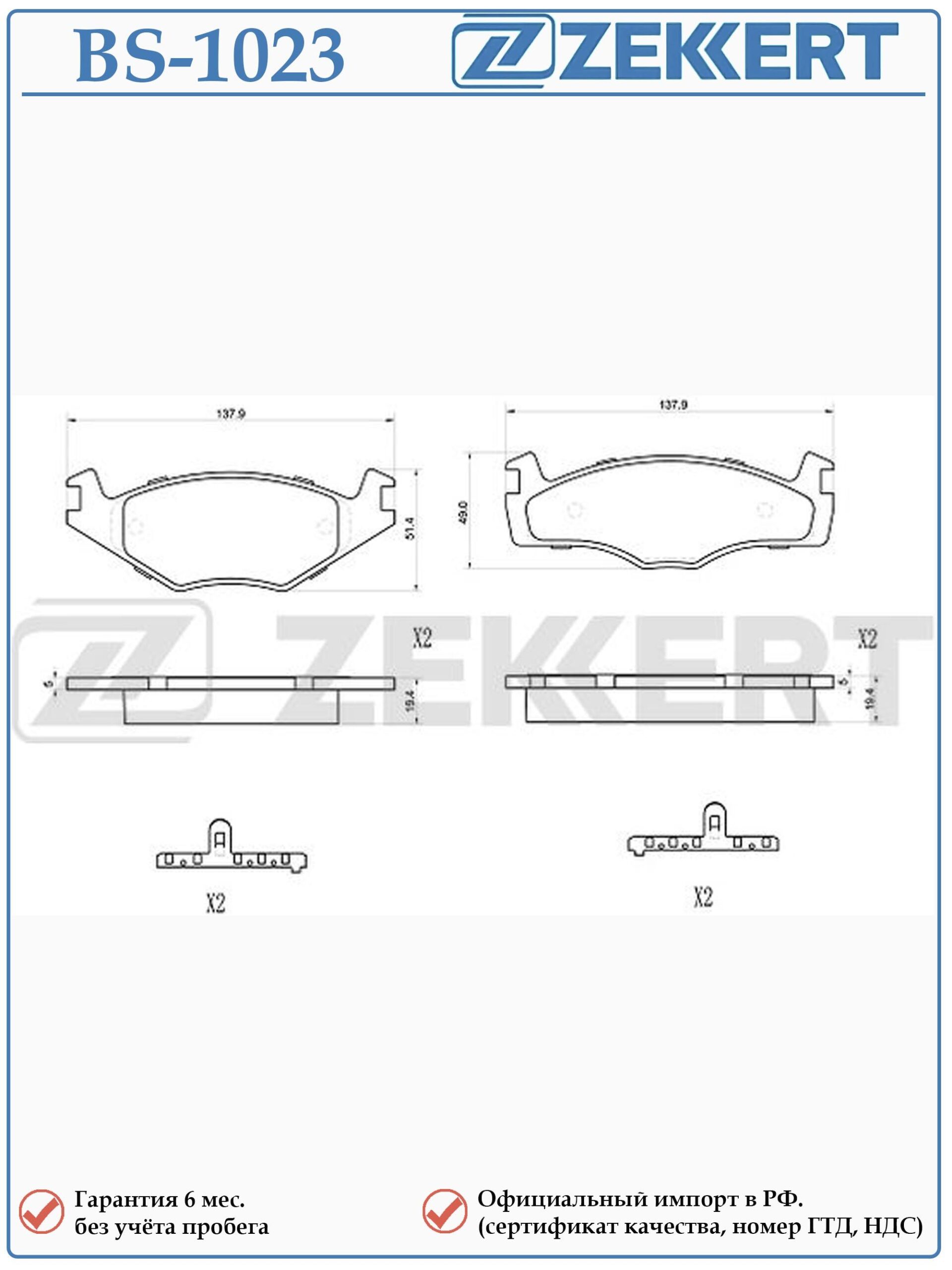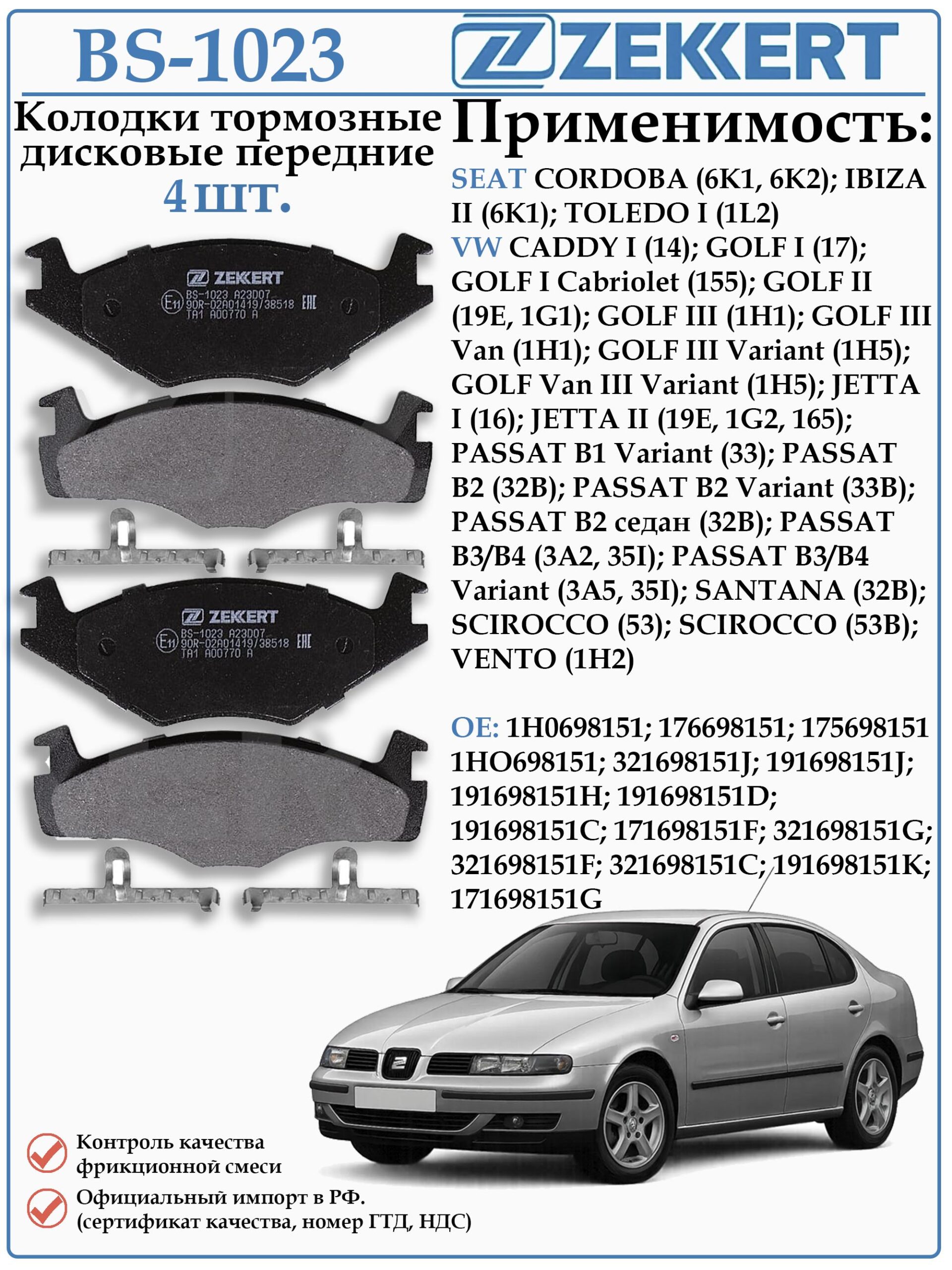 Колодки тормозные передние ZEKKERT BS-1023 для Сеат Кордоба, Ибица, Толедо, Фольксваген Кадди, Гольф, Пассат, Сантана, Сирокко, Венто.