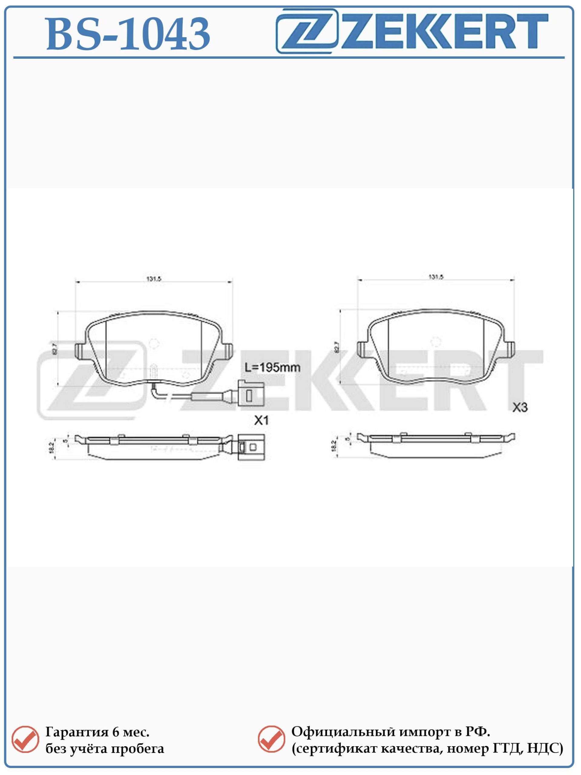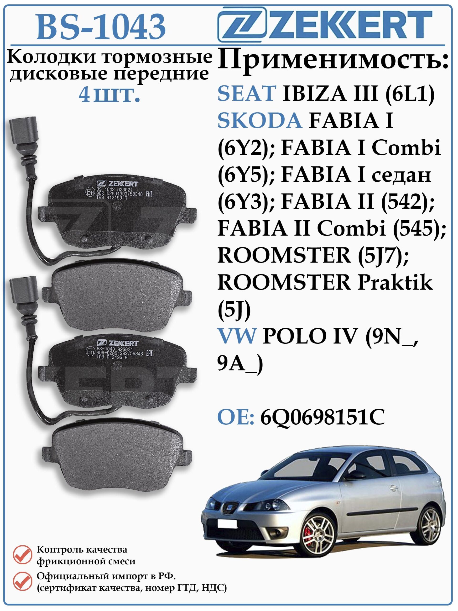 Колодки тормозные передние ZEKKERT BS-1043 для Сеат Ибица, Шкода Фабия, Румстер, Фольксваген Поло