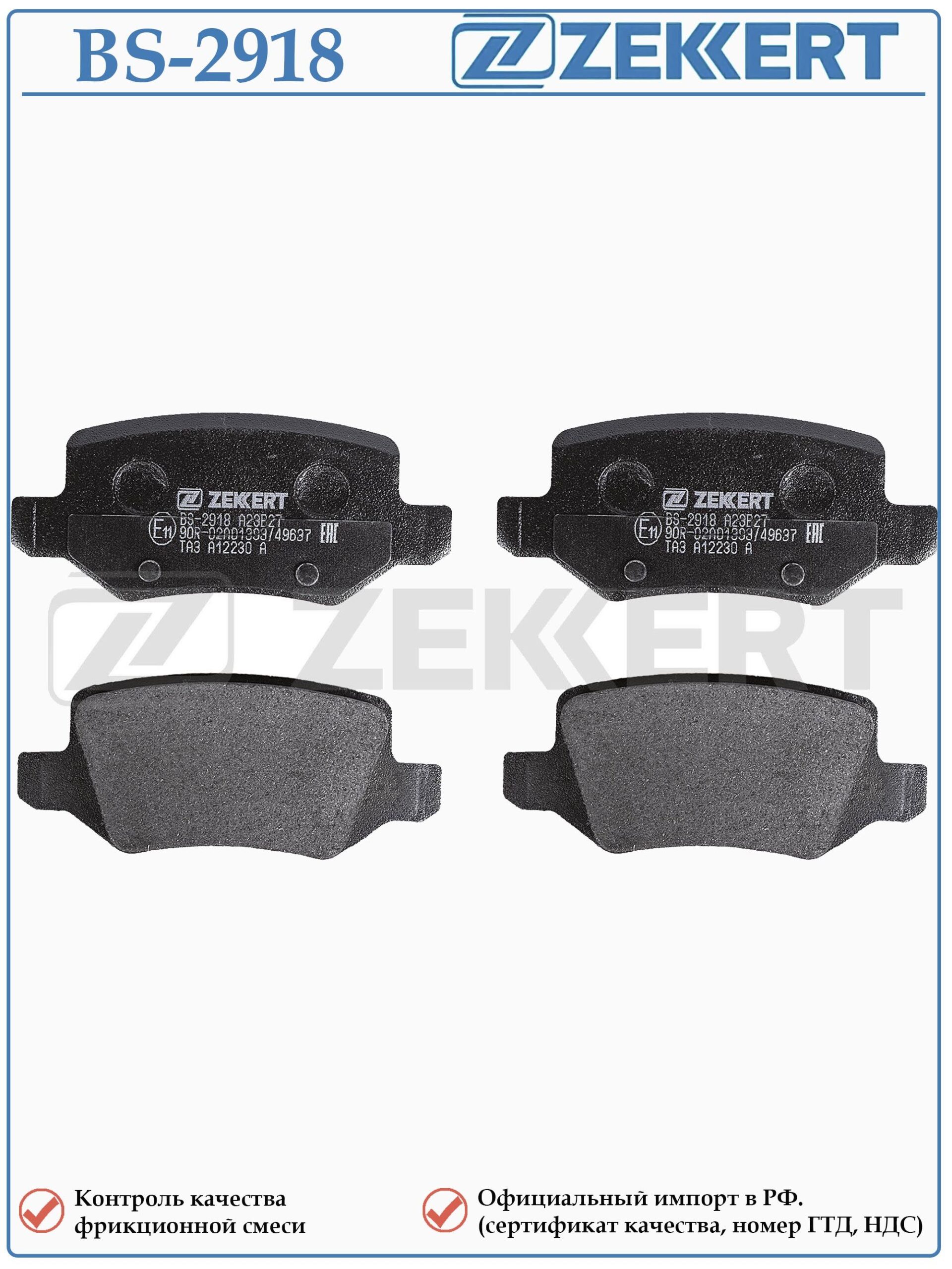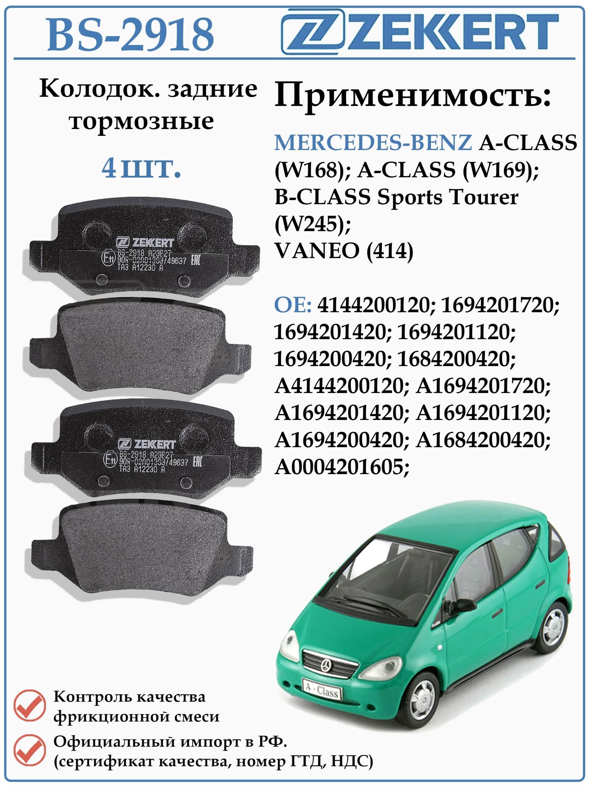 Колодки тормозные задние для Мерседес А-класса, Мерседес Ванео ZEKKERT BS-2918