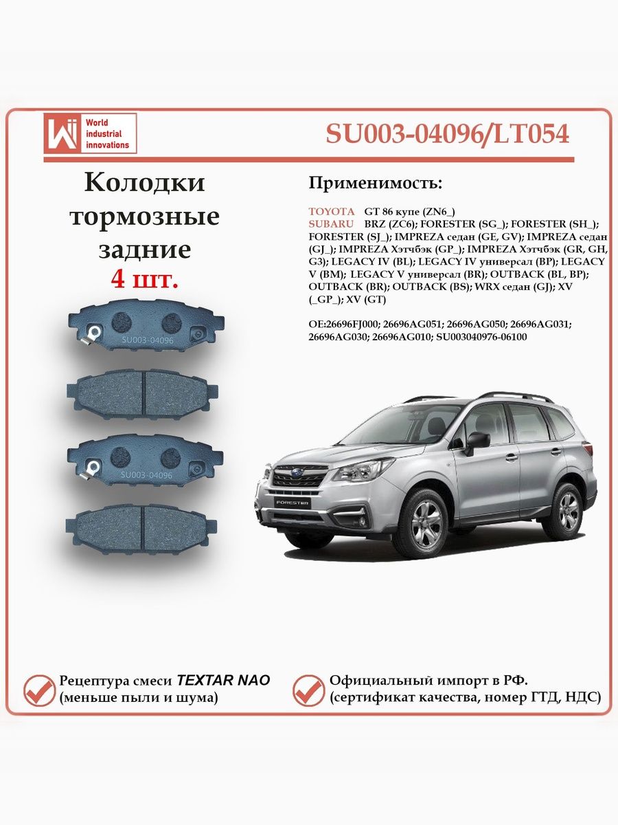 Колодки тормозные задние WII AUTO SU003-04096/LT054 для Тойота GT, Субару Форестер, Субару Импреза, Субару Оутбэк, Субару Легаси, Субару WRX