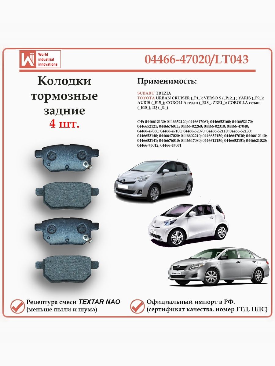 Колодки тормозные задние WII AUTO 04466-47020/LT043 для Тойота Королла, Ярис, Версо, Аурис, IQ, Субару Трезия