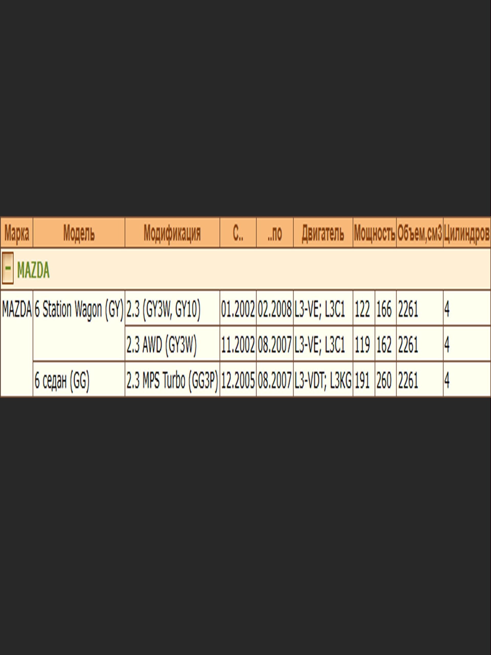 ✔ MAZDA 6 универсал (GY); 6 седан (GG)
