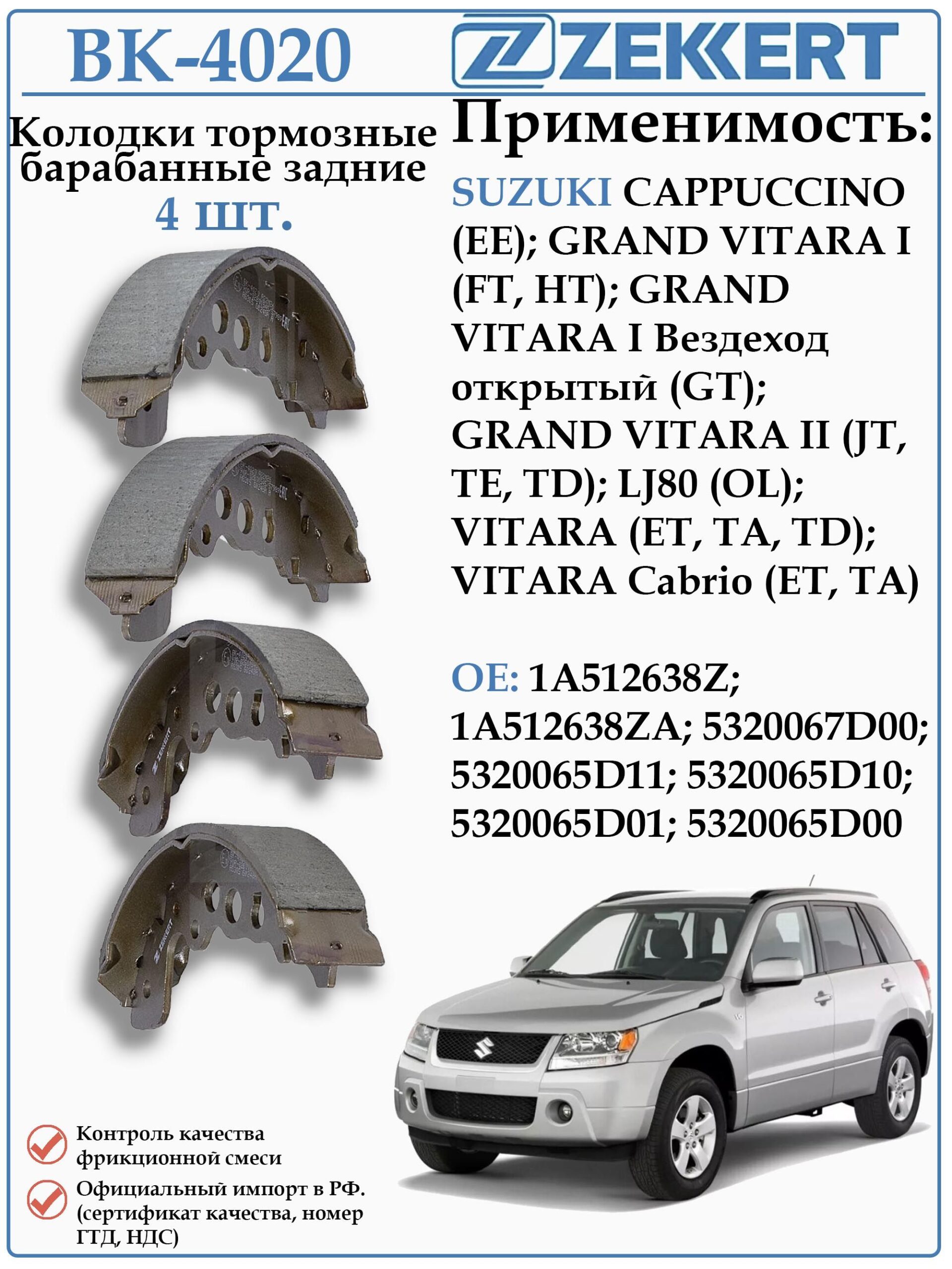 Колодки тормозные задние барабанные ZEKKERT BK-4020 для Сузки Витара, Гранд Витара