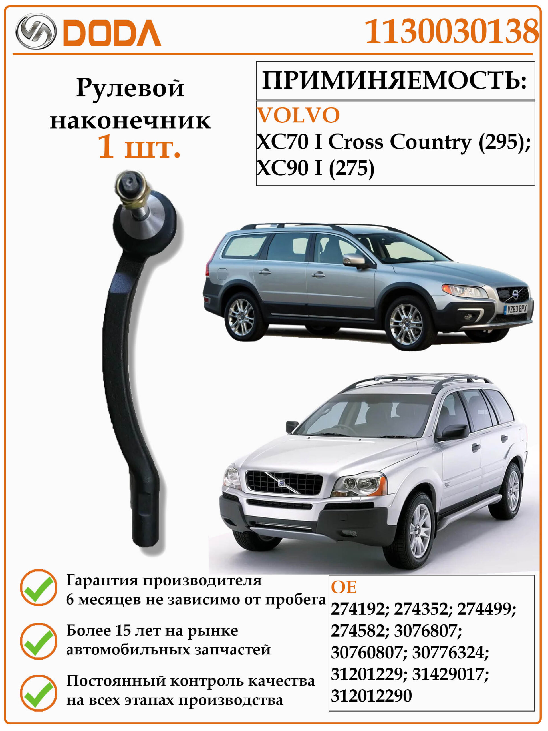 Наконечник рулевой тяги правый VOLVO XC70/90 (1130030138)