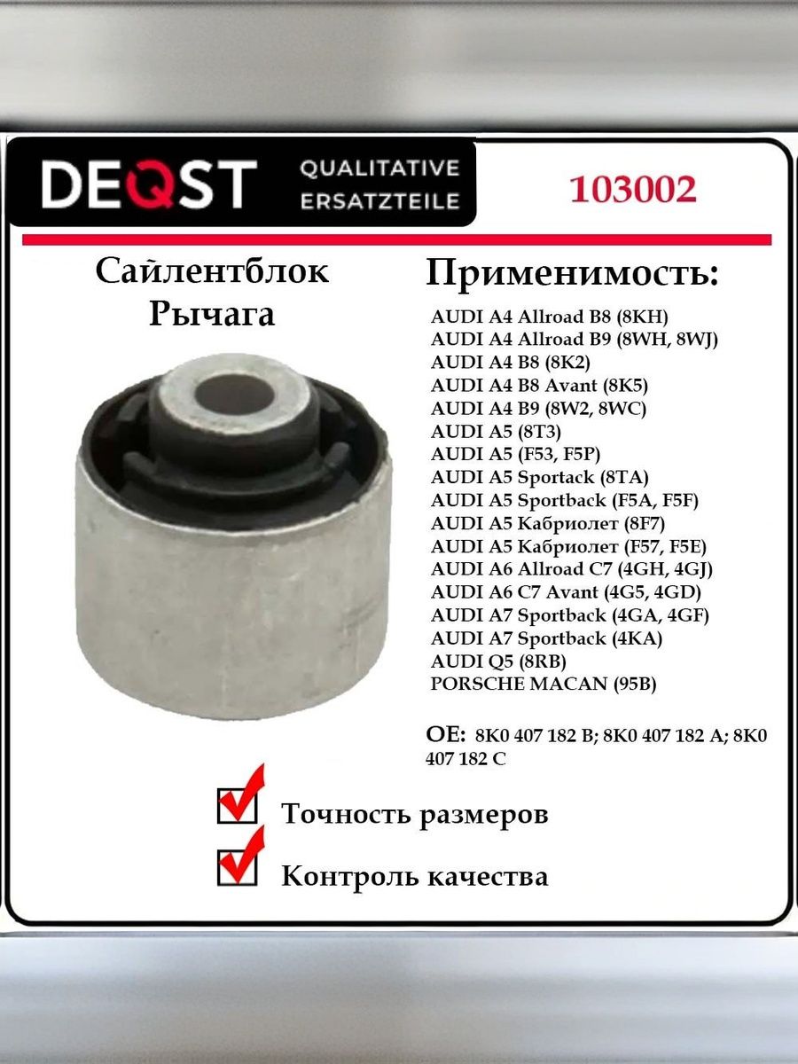 Установить сайлентблок от Deqst можно на большинство марок и моделей автомобилей, что делает его универсальным и востребованным среди автолюбителей и профессионалов.