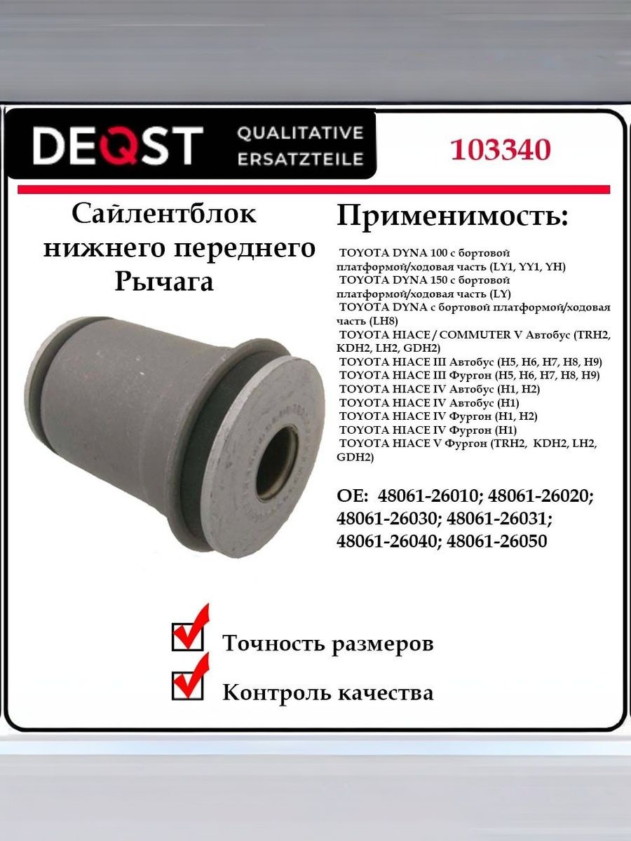Выбирая сайлентблок Deqst, вы получаете не только высококачественный продукт, но и уверенность в надежности вашего автомобиля. Улучшите подвеску своего автомобиля, минимизируйте износ деталей и наслаждайтесь комфортом езды с сайлентблоком Deqst.