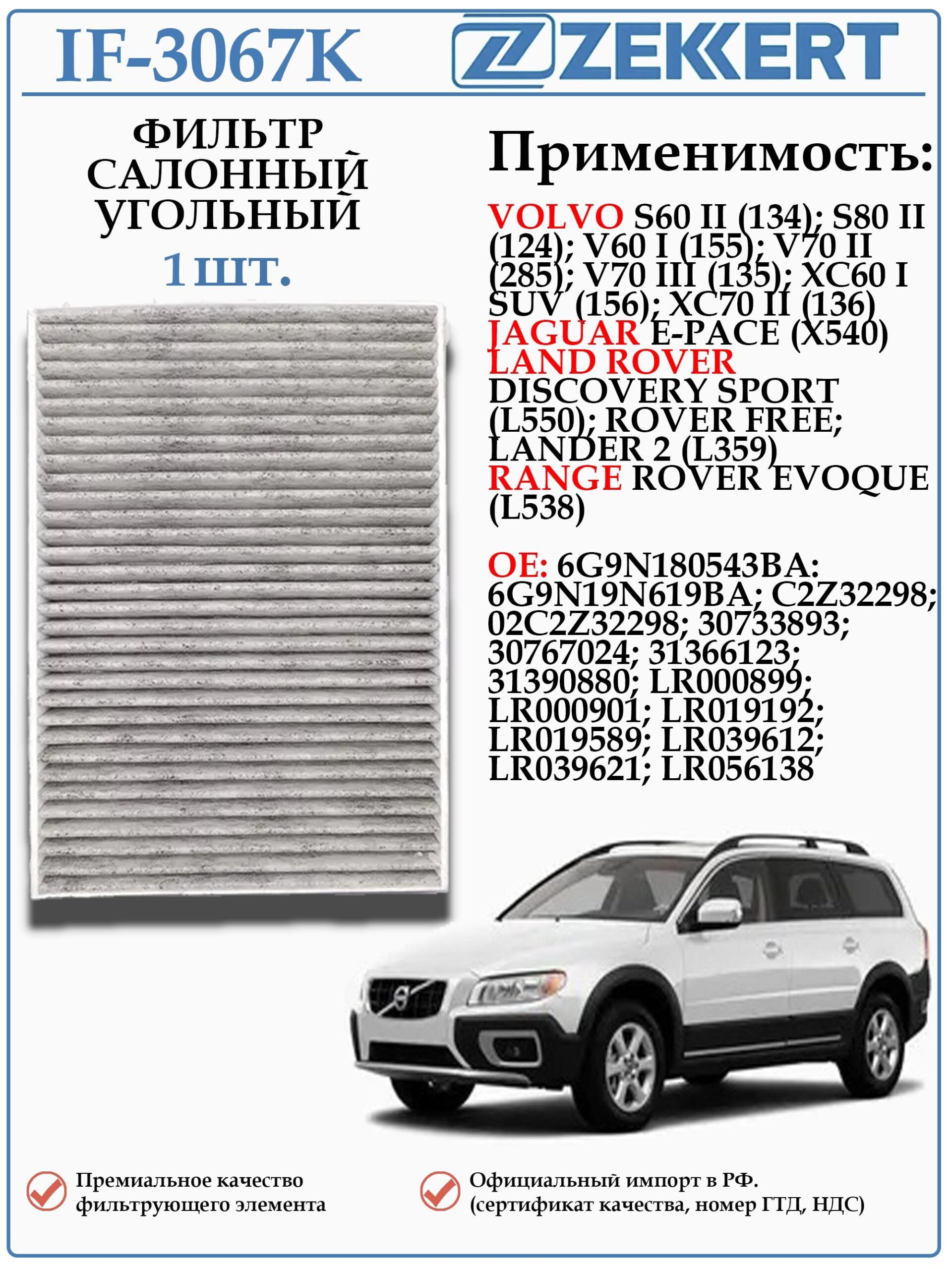 Фильтр IF-3067K применяется для Ягуар е пейс, Ленд ровер дискавери спорт, Ленд ровер фрилэндер, Рэнж ровер эвок, Вольво S60 S80 V60 V70 XC60 XC70