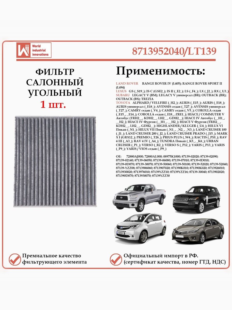 Салонный угольный фильтр применяется для автомобилей, Тойота, Лексус, Субару, Рэнж Ровер WII AUTO 8713952040/LT139