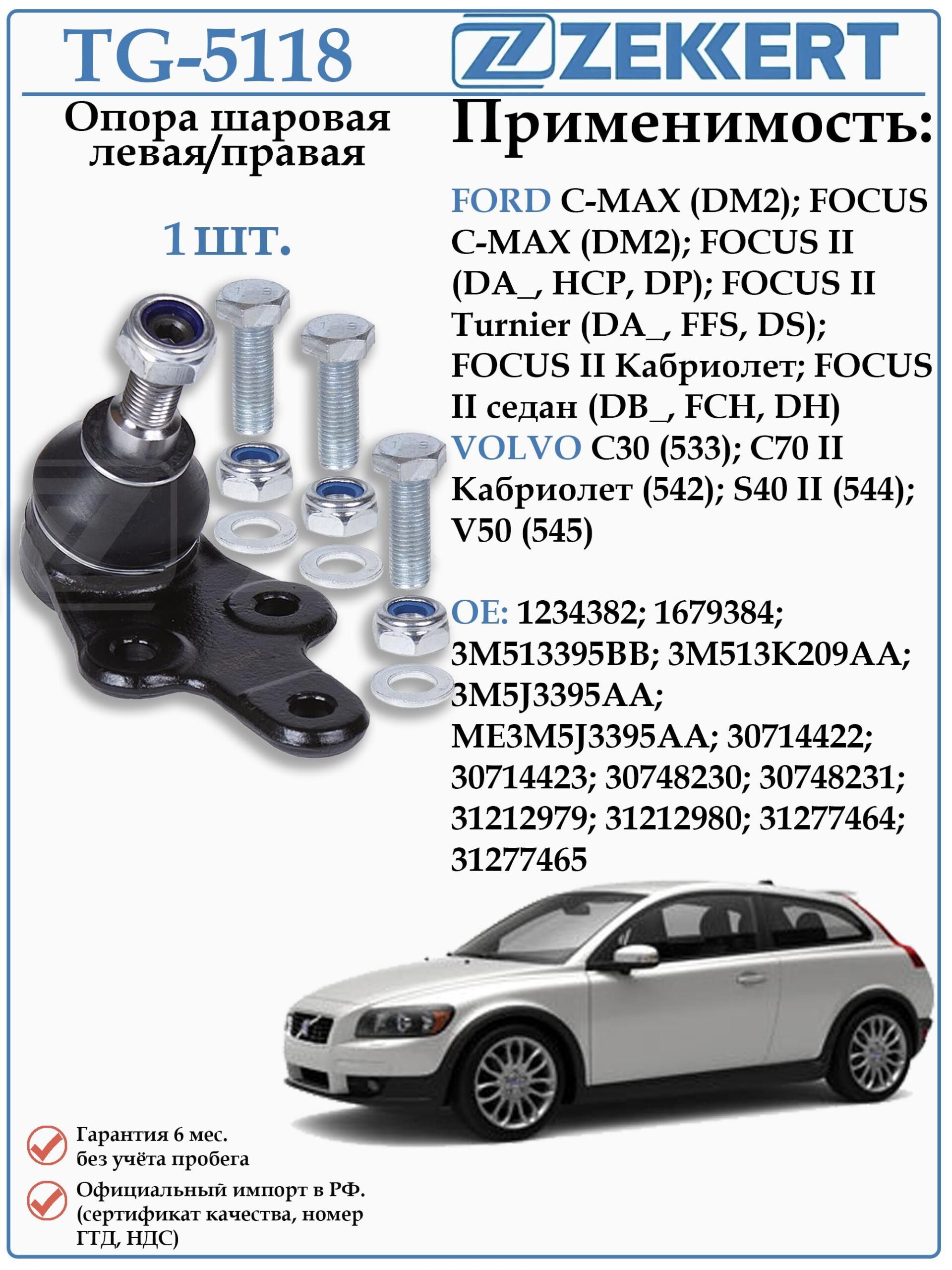Шаровая опора Левая/Правая для Форд Фокус второго поколения, C-MAX, Вольво С30, С70, V50, S40 ZEKKERT TG-5118