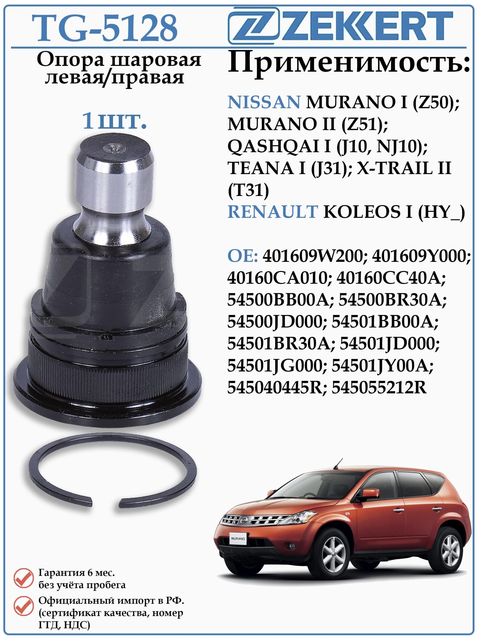 Шаровая опора Левая/Правая для Ниссан Кашкай, Мурано, Теана, Х-Трейл, Рено Колеос ZEKKERT TG-5128