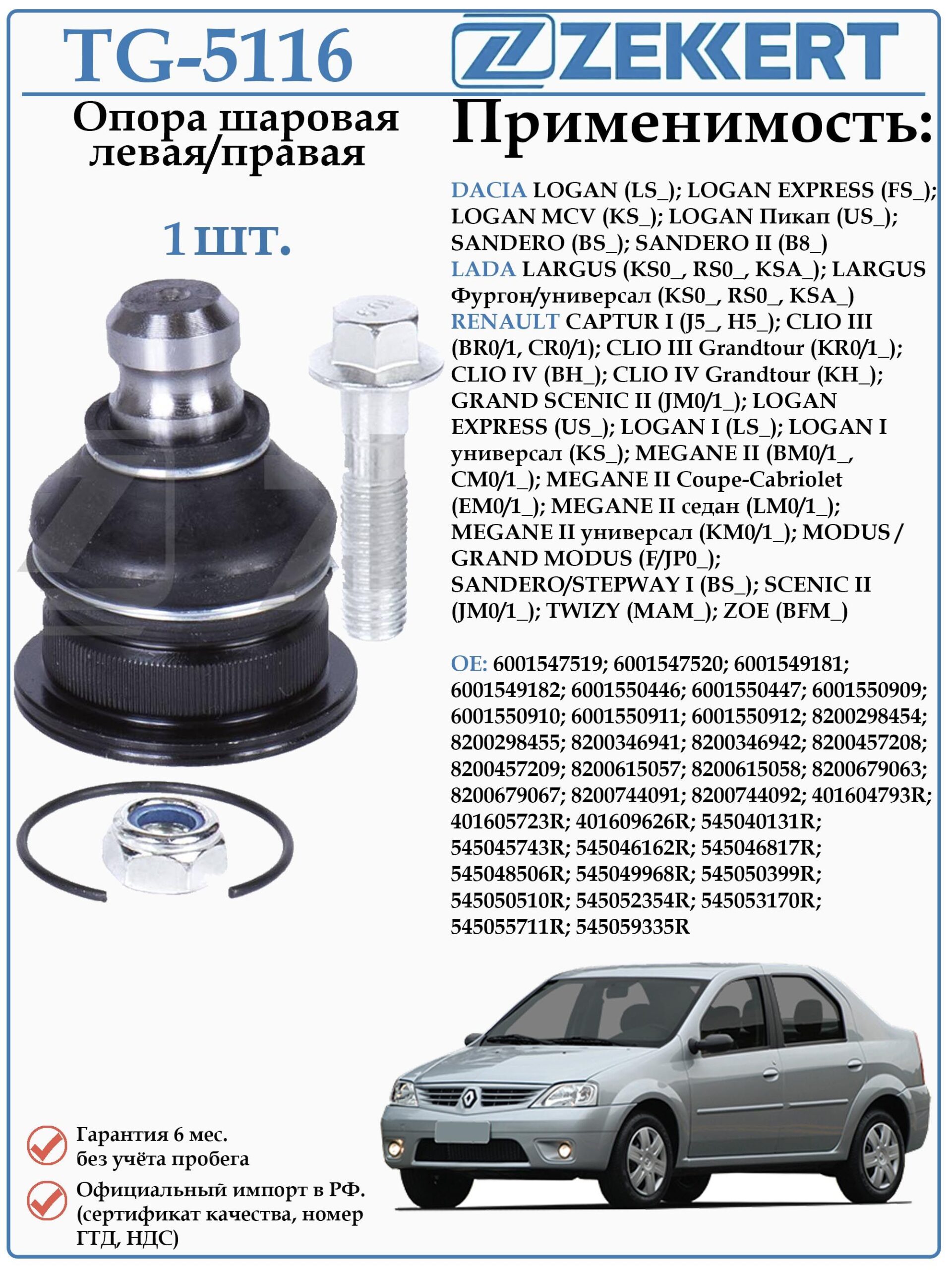 Шаровая опора Левая/Правая для Дачия Логан, Сандеро, Лада Ларгус, Рено Каптюр, Клио, Сценик, Гранд Сценик, Меган, Логан, Сандеро, Степвей, Твиз ZEKKERT TG-5116