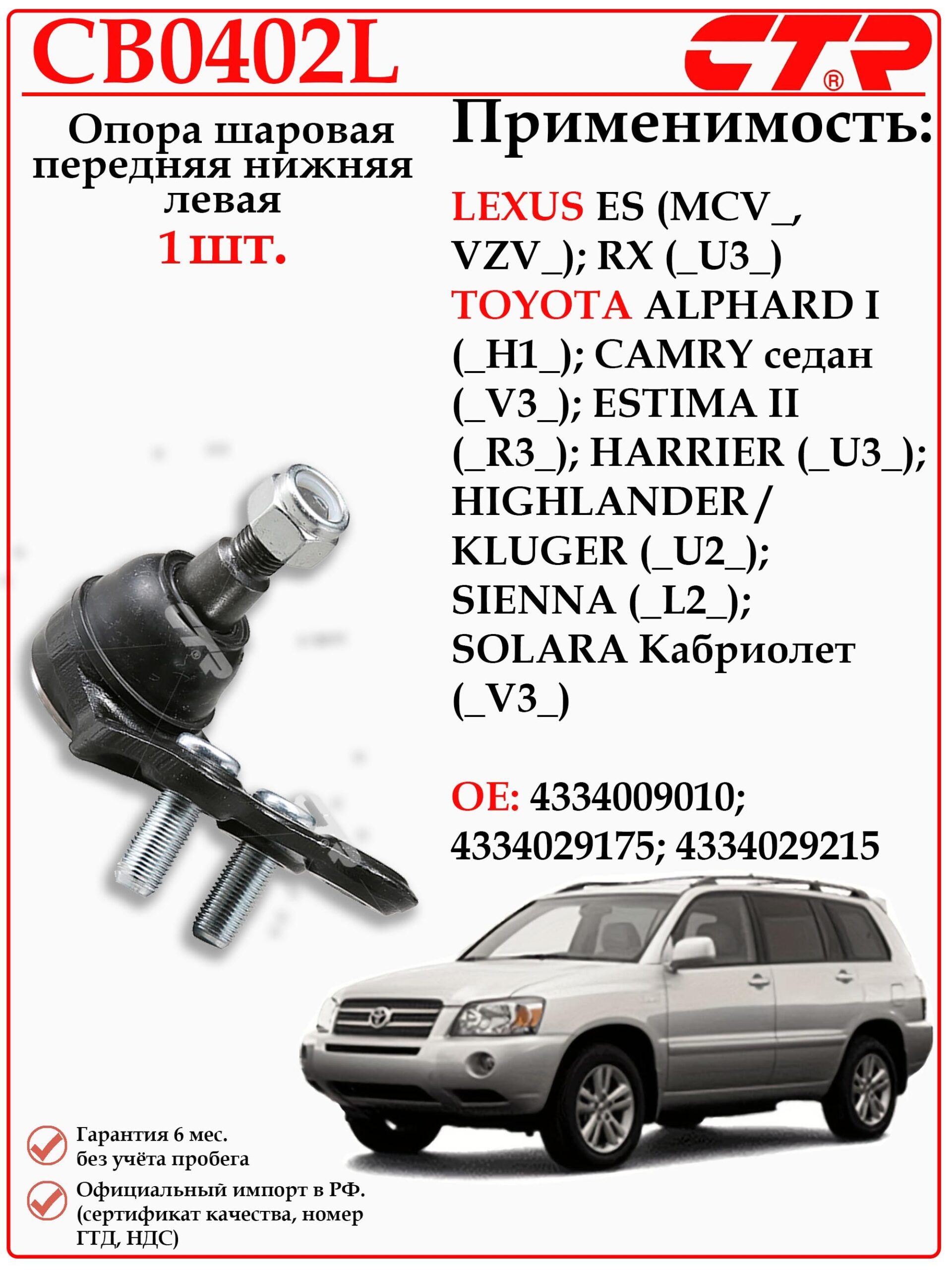 Шаровая опора Левая для Тойота Альфард, Камри, Эстима, Харриер, Хайлендер, Сиенна, Солара, Лексус RX, ES CTR CB0402L