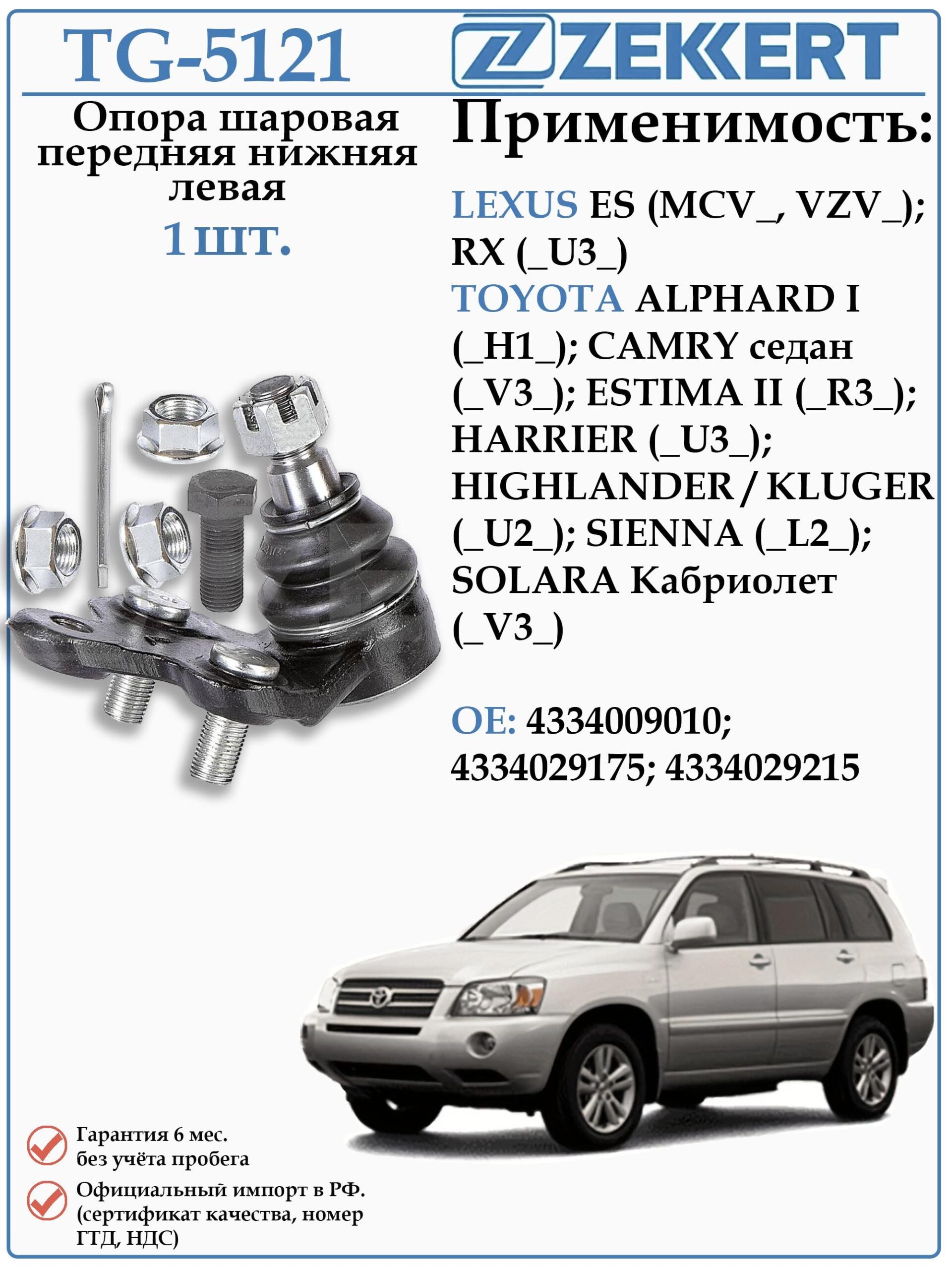 Шаровая опора Левая для Тойота Альфард, Камри, Эстима, Харриер, Хайлендер, Сиенна, Солара, Лексус RX, ES ZEKKERT TG-5121
