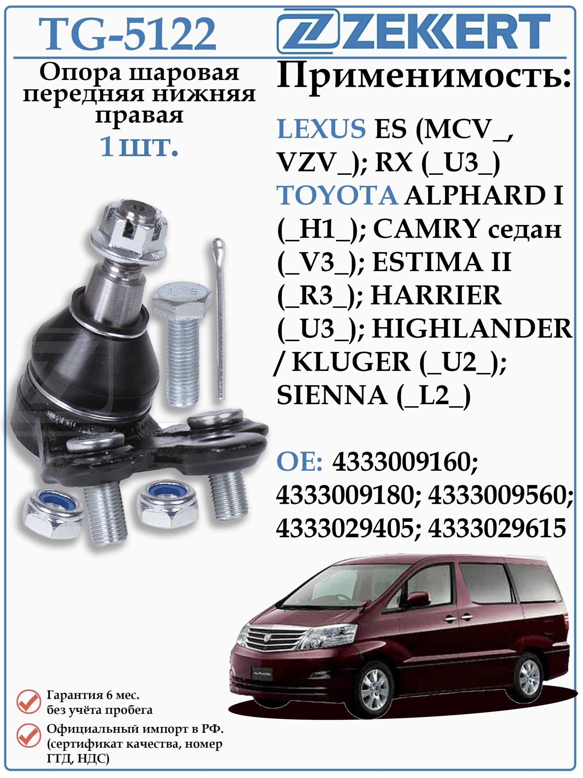 Шаровая опора Правая для Тойота Альфард, Камри, Эстима, Харриер, Хайлендер, Сиенна, Лексус RX, ES ZEKKERT TG-5122